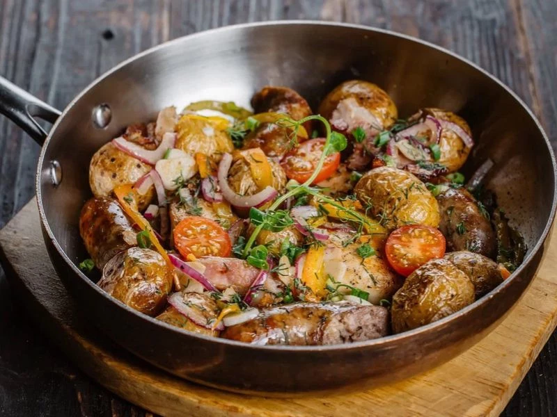 Картофель с обжаренными копчёными колбасками